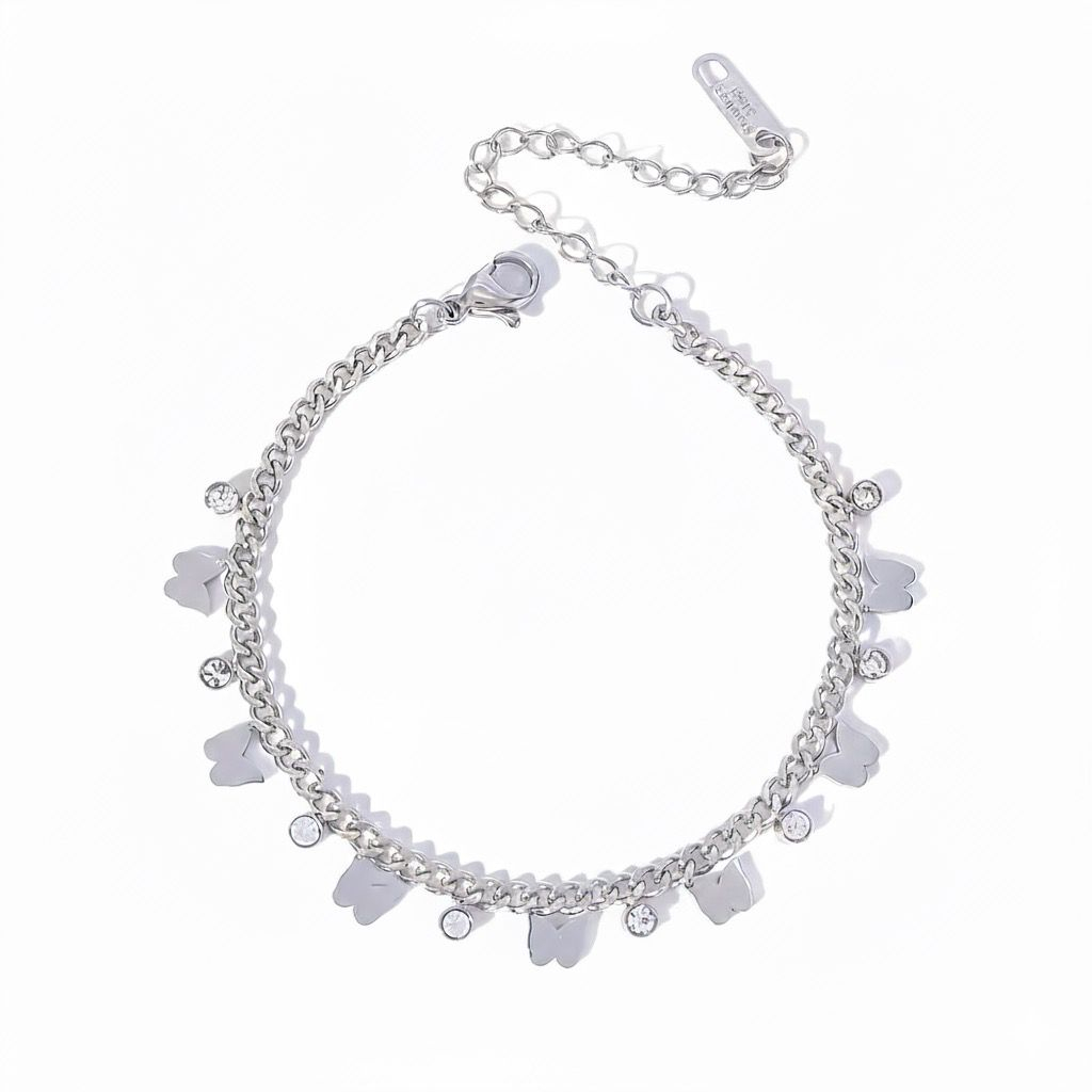 Un accesoriu delicat și rafinat, care adaugă strălucire și eleganță ținutelor tale. Brățara este decorată cu fluturași argintii și cristale strălucitoare, creând un efect vizual jucăuș și sofisticat în același timp. Este perfectă pentru femeile care iubesc bijuteriile fashion cu detalii romantice și feminine.