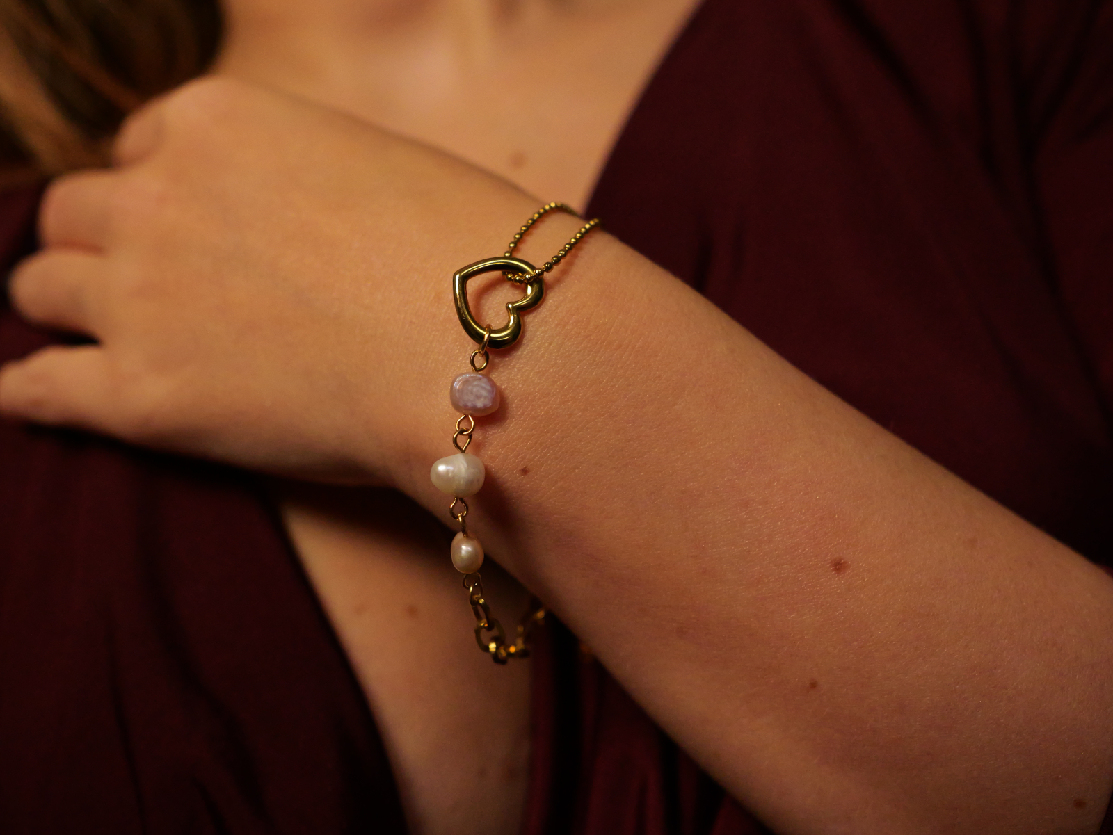 O brățară delicată și feminină, decorată cu perle albe strălucitoare și un pandantiv în formă de inimă, simbol al iubirii și rafinamentului. Realizată din oțel inoxidabil placat cu aur, această bijuterie îmbină eleganța clasică a perlelor cu farmecul unui detaliu romantic, oferind un plus de strălucire oricărei ținute.