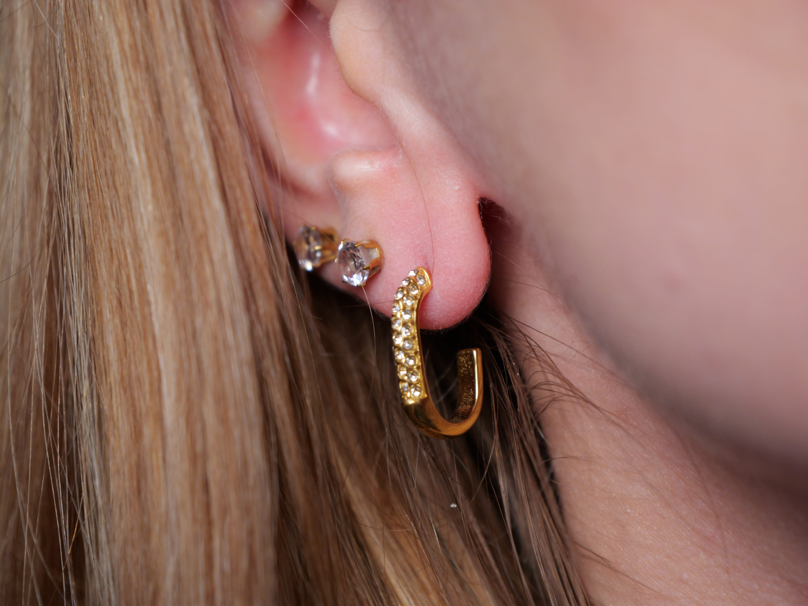 Realizați din oțel inoxidabil placat cu aur, acești cercei sunt hipoalergenici, rezistenți la uzură și confortabili de purtat. Combinația dintre formă modernă și cristale strălucitoare îi transformă într-un accesoriu perfect pentru evenimente speciale sau ținute chic de zi cu zi.