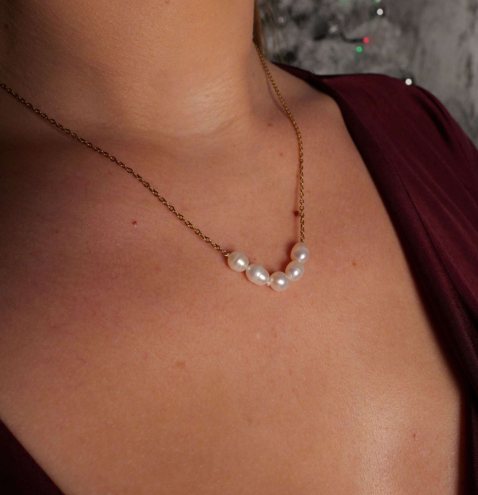 Confecționat din oțel inoxidabil placat cu aur, colierul este hipoalergenic, rezistent la apă și oxidare, și confortabil la purtare. Cele cinci perle adaugă un strop de lux discret și un efect vizual rafinat, potrivit pentru ținute casual sau ocazii speciale.