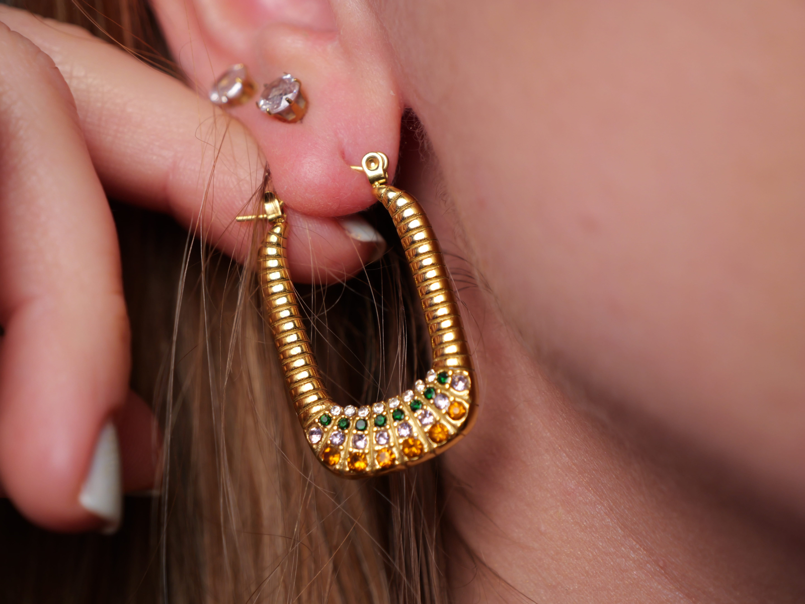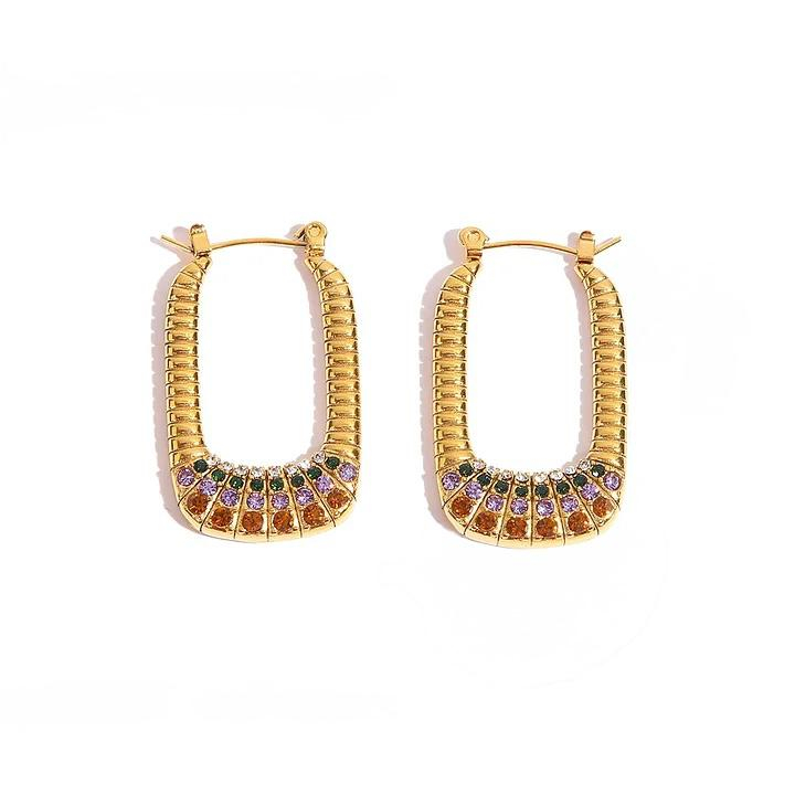 Realizați din oțel inoxidabil placat cu aur, acești cercei sunt hipoalergenici, rezistenți la apă și își păstrează strălucirea intensă în timp. Designul lor modern, dar plin de viață, îi face alegerea ideală pentru femeile care iubesc bijuteriile elegante, cu o notă de culoare și originalitate.