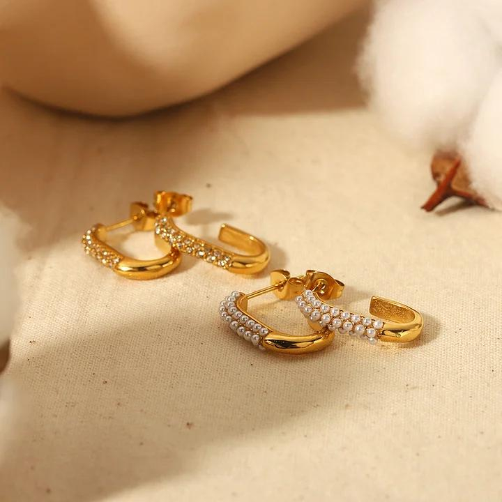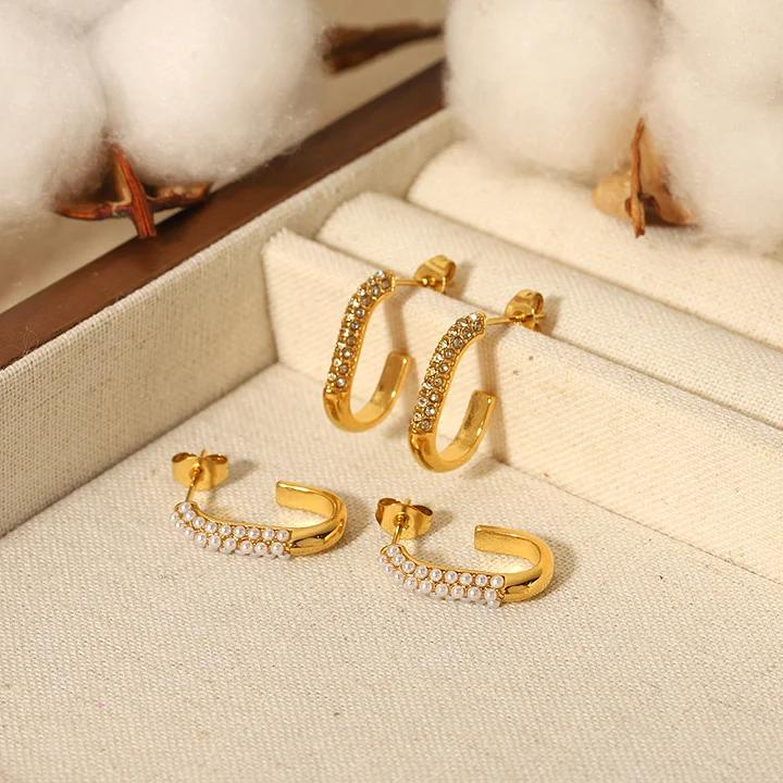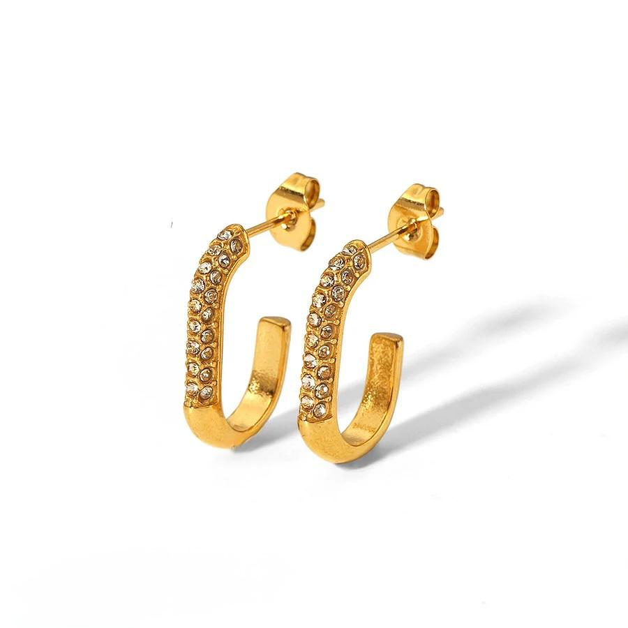 Realizați din oțel inoxidabil placat cu aur, acești cercei sunt hipoalergenici, rezistenți la uzură și confortabili de purtat. Combinația dintre formă modernă și cristale strălucitoare îi transformă într-un accesoriu perfect pentru evenimente speciale sau ținute chic de zi cu zi.