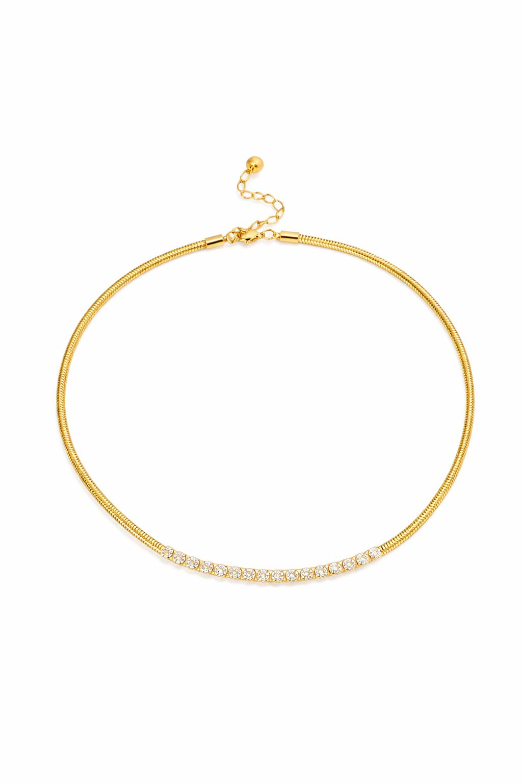 Realizat din oțel inoxidabil placat cu aur, chokerul îmbină stilul modern cu luxul discret, fiind alegerea perfectă pentru femeile care iubesc bijuteriile sofisticate, dar versatile. Poate fi purtat atât la evenimente de seară, cât și pentru a transforma o ținută simplă într-una spectaculoasă.